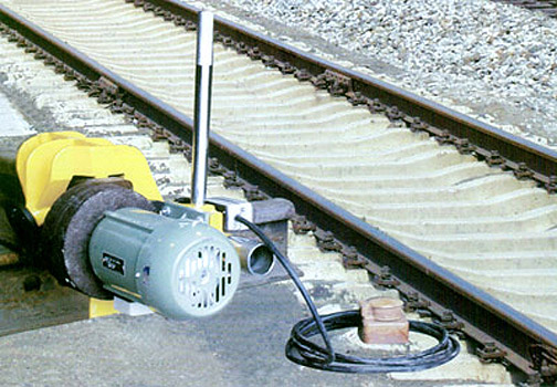 鋼軌焊接前,可用鋼軌端頭打磨機(jī)對(duì)鋼軌端頭的橫斷面進(jìn)行精確打磨。該種打磨機(jī)在各個(gè)方位均有良好的平衡性,所以操作起來(lái)非常容易。馬鞍型夾軌鉗把打磨機(jī)固定在被磨削鋼軌端部的軌頭上。磨頭的移動(dòng)是由一個(gè)手柄來(lái)控制的,其移動(dòng)的范圍處于垂直于鋼軌的橫斷面內(nèi)。磨頭的移動(dòng)與砂輪的轉(zhuǎn)動(dòng)兩者組合運(yùn)動(dòng),能夠確保鋼軌端頭被磨削的橫斷面獲得良好的精度、垂直度和光潔度。